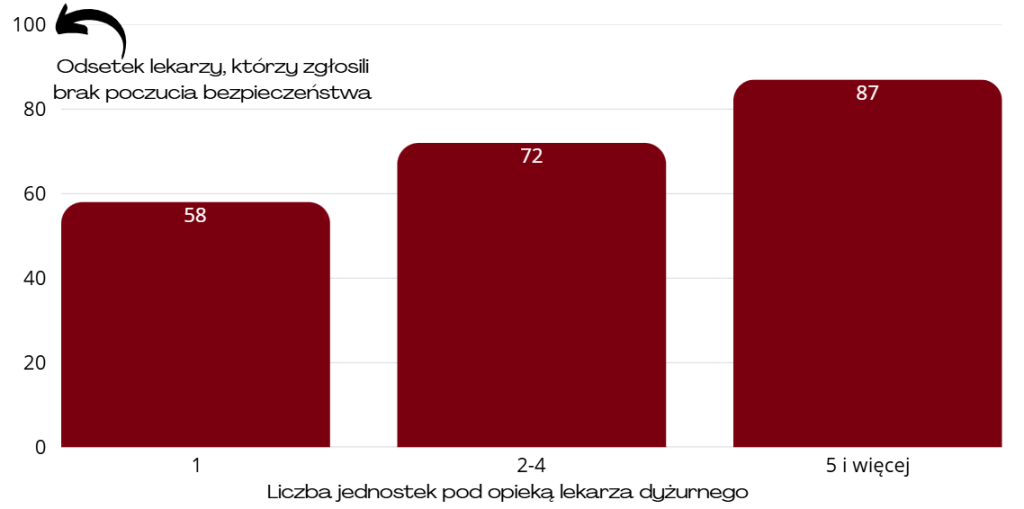 • bycia zmuszanym do dyżurów, gdzie wśród lekarzy, którzy czuli się zmuszeni 94% nie czuło się bezpiecznie, a osoby nie zmuszane 71%,