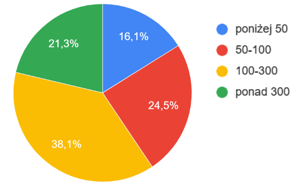 Jeżeli chodzi o liczbę pacjentów pod opieką jednego lekarza w trakcie specjalizacji, to  wyniki są następujące: 16% badanych ma pod opieką do 50 pacjentów, pomiędzy 50 a 100 pacjentów ma 25% badanych. W 51% przypadków lekarze zgłaszają, że mają ponad 100 pacjentów pod opieką, a w 20% przypadków mają pod opieką ponad 300 pacjentów