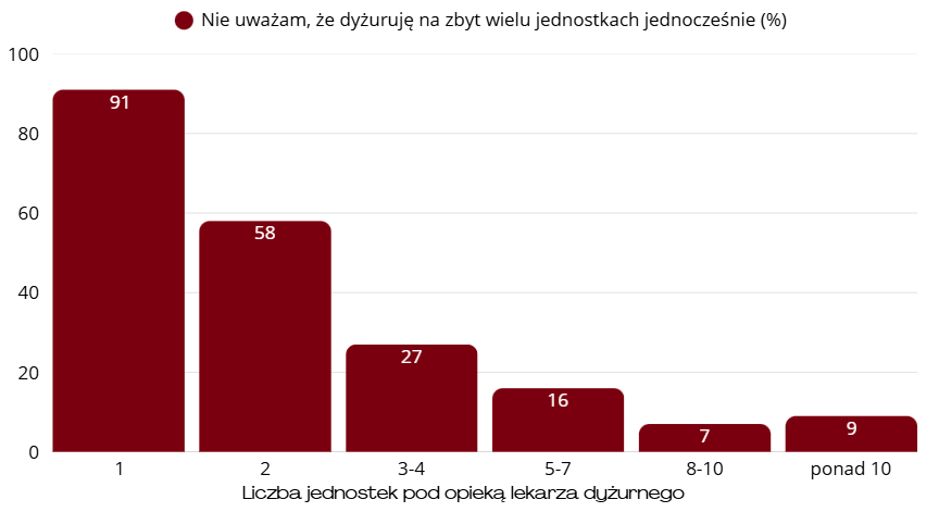 Z zebranych danych jednoznacznie wynika, że większość respondentów jest usatysfakcjonowana liczbą jednostek pod swoją opieką, gdy dyżuruje w jednej jednostce. To przekonanie dramatycznie spada wraz ze wzrostem liczby jednostek pod opieką.