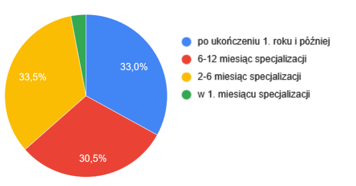 Komentarz: cieszy z pewnością fakt, że 79% lekarzy w trakcie specjalizacji rozpoczyna dyżurowanie od dyżurów towarzyszących, co pozwala im pod okiem starszych i bardziej doświadczonych kolegów przygotować się do sprawowania opieki nad pacjentami w trakcie dyżurów samodzielnych. Jednakże 67% lekarzy rozpoczyna samodzielne dyżury medyczne wcześniej niż po roku od rozpoczęcia specjaliacji, a aż 36,5% ankietowanych zaczyna samodzielne dyżury w pierwszych 6 miesiącach od rozpoczęcia specjalizacji (3% ankietowanych rozpoczyna nawet w 1. miesiącu specjalizacji).