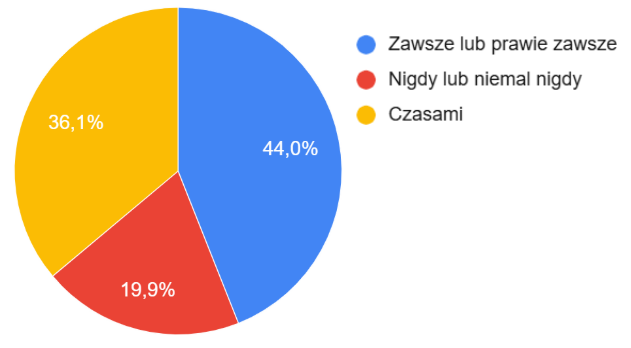 Jak wynika z zebranych danych, jedynie w przypadku 44% ankietowanych podczas całodobowego dyżuru na terenie danego podmiotu leczniczego jest dostępny lekarz ze specjalizacją. Niemal 20% badanych zgłasza, że podczas ich dyżuru na terenie placówki nigdy nie ma lekarza specjalisty